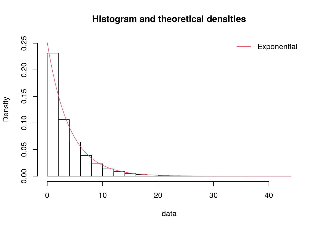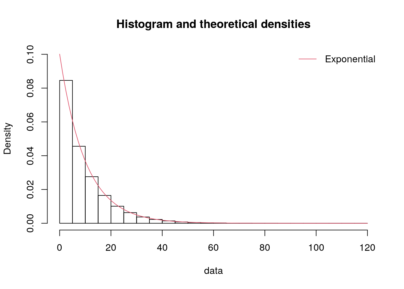 print(data["service_mins"].dropna().mean())We will use the rexp() function from the stats package which requires the rate parameter, not the mean.