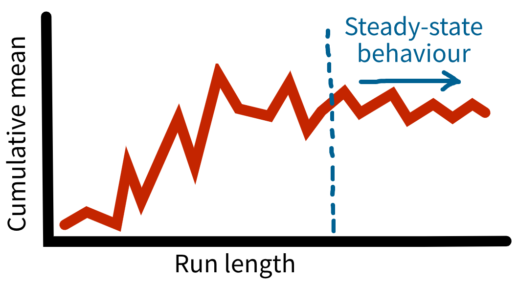 A warm-up period helps address initialisation bias, which occurs when a simulation begins in an “empty” state that doesn’t reflect how the real system usually operates. In this early phase, performance measures can be unusually high or low because the system hasn’t yet settled into typical conditions. Running the model for a warm-up period before collecting results allows it to reach steady-state behaviour - a stage where performance measures are stable and represent typical, ongoing behaviour.