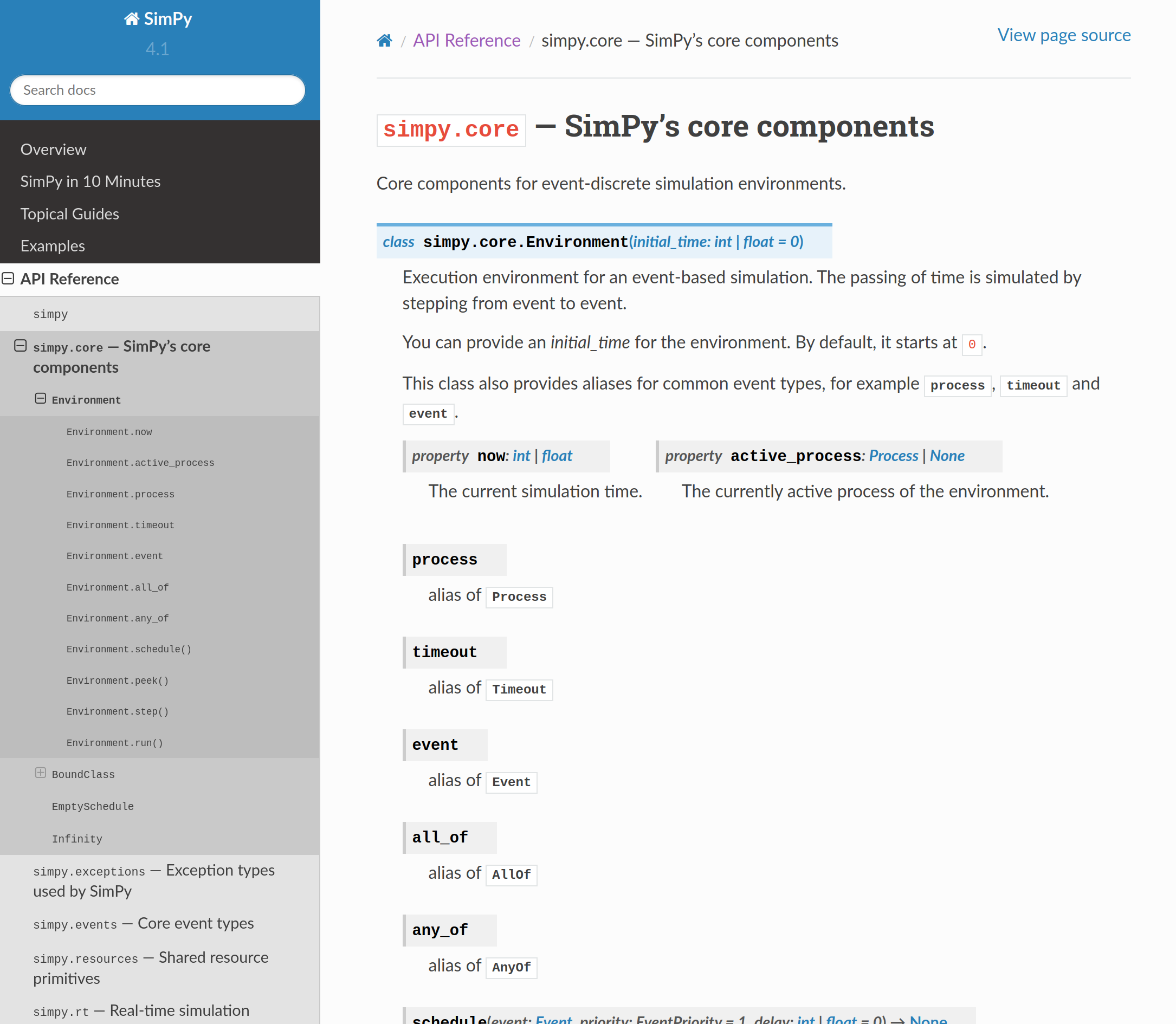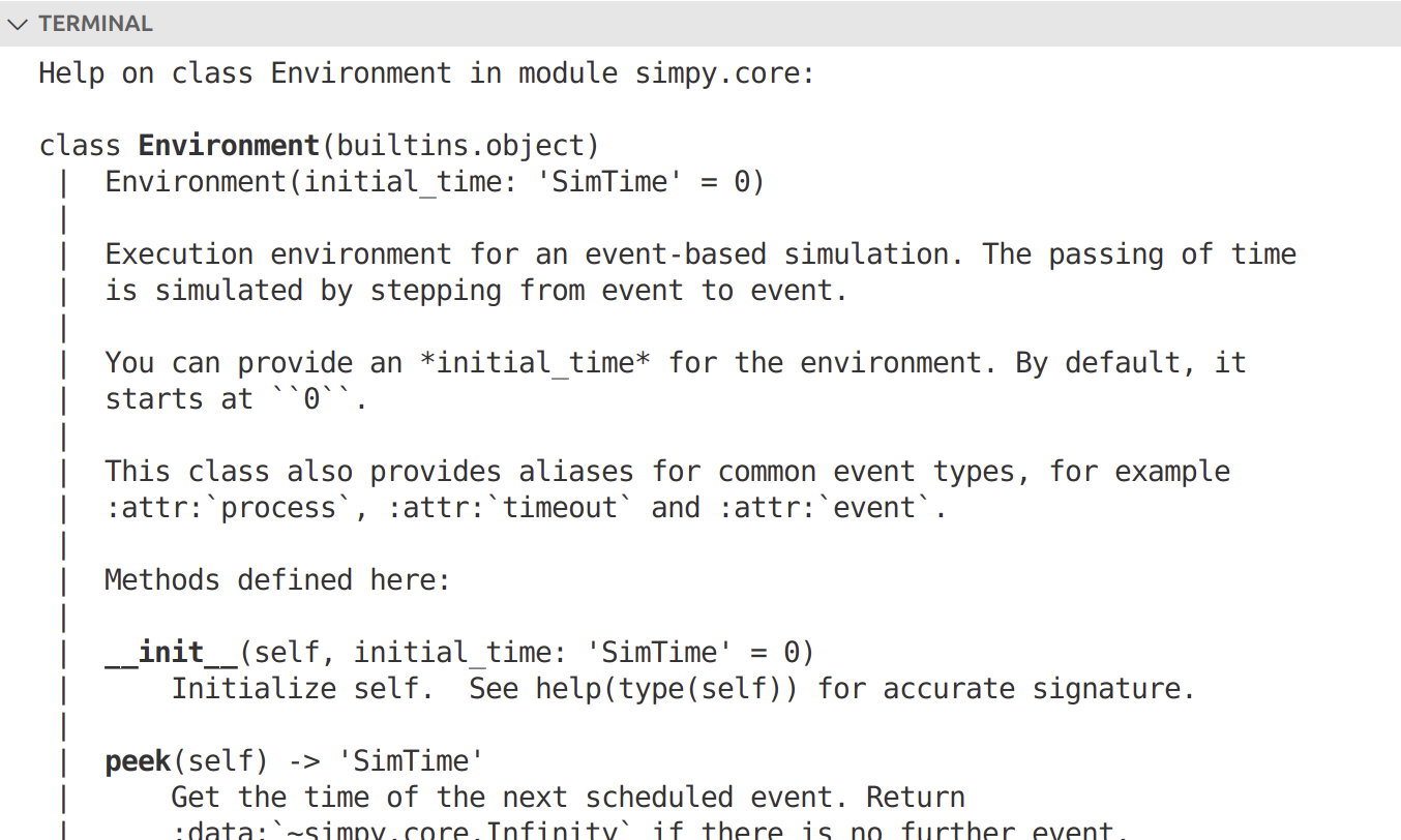 Environment()class.library(simpy) help(simpy.core.Environment)This will display: