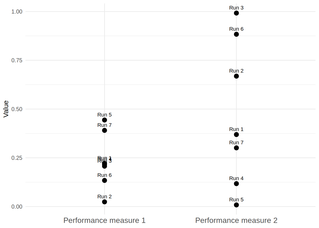 In the plot below, each point shows the value of a performance measure from one independent run of the same simulation model, and the labels (“Run 1”, “Run 2”, …) identify which run it came from. The horizontal axis has two different performance measures (for example, average waiting time and resource utilisation), and you can see that even though the model is unchanged, the values jump around from run to run because of randomness in arrivals, service times, and other processes. This mirrors what happens in real systems: some days are “good” (short waits, lower utilisation), others are “bad” (long waits, higher utilisation), and we need multiple runs to understand both the typical performance and how much it varies.